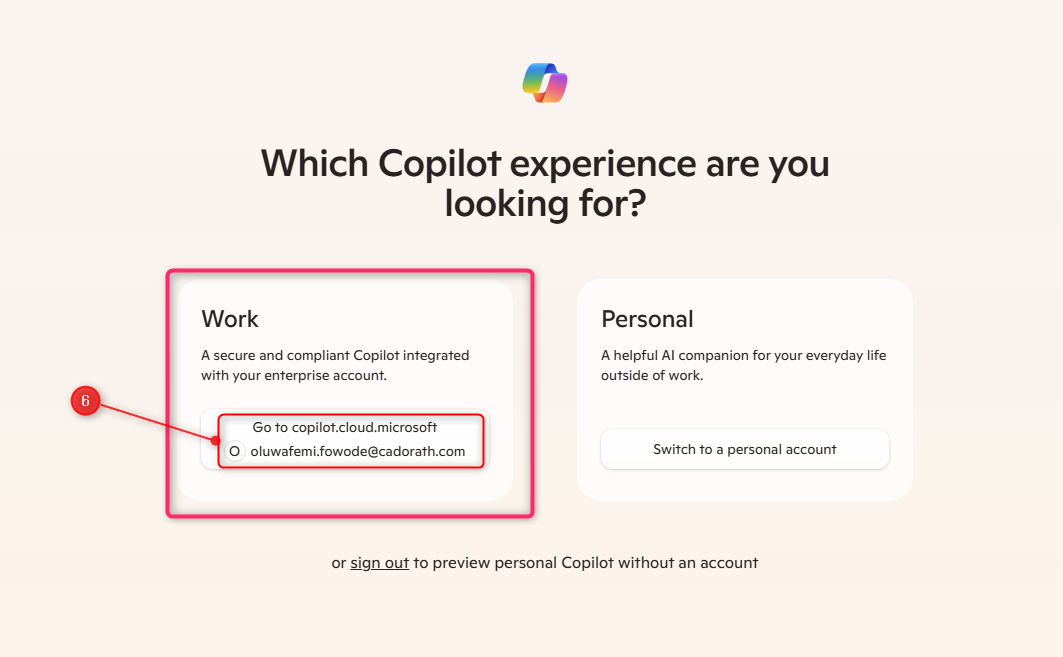 (5) Click on "Go to copilot.cloud.microsoft" under "Work".